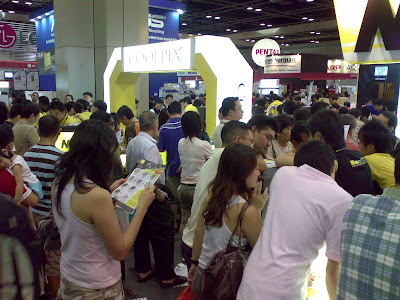 Hubby said he had read in the papers that Nikon was offering something interesting, so we made our way upstairs to have a look. The main hall was also very crowded, but there was more space to move around. We checked out the very crowded Nikon booth.